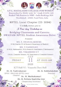 A.P.C. Mahalaxmi College for Women, Thoothukudi (NPTEL Local Chapter – ID: 3094), warmly invites you to a one-day workshop titled “Bridging Classrooms and Careers: SWAYAM-NPTEL Student Awareness Drive”, scheduled for Friday, July 11, 2025, at 10:00 AM in Vasanthi Devi Hall. The event will feature insightful presentations by Ms. S. Dhanalakshmi of II MA English, Ms. V. Vaishnavi of II M.Sc. Mathematics, and Ms. Vikashini S. T. of I M.Sc. Computer Science, under the guidance of Dr. R. Vadivukarasi, SWAYAM-NPTEL SPOC. The workshop is organized with the support of Dr. K. Subbulakshmi, Principal, and organised by Dr. M. Muthukumari and Dr. R. Felista Sugirtha Lizy. All are cordially invited to attend and benefit from this enriching session.