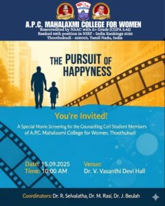 The Counselling Cell of A.P.C. Mahalaxmi College for Women, Thoothukudi organized a special movie screening “The Pursuit of Happiness” for the student members on 15th September 2025 at 10.00 a.m. in the Dr. Vasanthi Devi Hall.