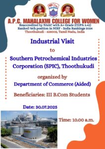 The Department of Commerce (Aided) of A.P.C. Mahalaxmi College for Women, Thoothukudi, organized an Industrial Visit to SPIC, Thoothukudi, on 30th July 2025 at 10.00 a.m. for the students of III B.Com.