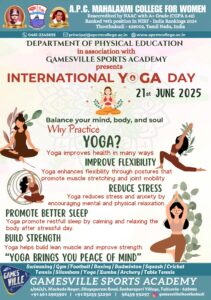 The Department of Physical Education, A.P.C. Mahalaxmi College for Women, Thoothukudi, in association with Gamesville Sports Academy, Thoothukudi, organized a three-day celebration to mark International Yoga Day. On 21st June 2025, a Mass Yoga session was conducted on campus, led by Ms. Revathi Sudhakar, Yoga Instructor from Gamesville Sports Academy, with the participation of around 55 students. On the following day, 22nd June 2025, yoga awareness pamphlets were distributed to the public to promote the significance of yoga in everyday life. The celebration concluded with a Workshop on Brain Yoga on 23rd June 2025, conducted by Ms. S. Mareeswari, a Pranic Healing Instructor from the Pranic Healing Centre, Thoothukudi, which saw the participation of approximately 450 students. The three-day event highlighted the physical, mental, and emotional benefits of yoga, fostering health and well-being among students and the wider community.![]()
