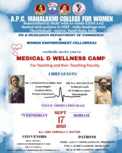 The PG & Research Department of Commerce and the Women Empowerment Cell (WERA) of A.P.C. Mahalaxmi College for Women, Thoothukudi, are organizing a Medical & Wellness Camp for all Teaching and Non-Teaching Faculty.