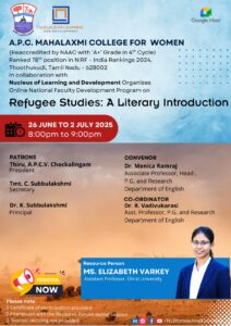 The P.G. and Research Department of English at A.P.C. Mahalaxmi College for Women, Thoothukudi, in collaboration with the Nucleus of Learning and Development, Vadodara, is organizing a five-day Online National Faculty Development Programme on the theme “Refugee Studies: A Literary Introduction” from 26th June to 2nd July 2025, under the framework of the academic MoU.