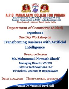 The Department of Commerce (Aided) of A.P.C. Mahalaxmi College for Women, Thoothukudi, conducted a One Day Workshop on Transforming Business with Artificial Intelligence on 31st July 2025, from 9.30 a.m. to 3.30 p.m., for B.Com. students. The workshop aimed to provide hands-on training in the use of Artificial Intelligence tools and their applications in business contexts. Students were introduced to 20 different AI applications, including tools for image processing, text generation, and multimedia content creation. The interactive sessions enabled students to explore practical uses of AI, enhancing their digital competency and preparing them for emerging trends in the business world. The workshop received enthusiastic participation and proved to be a highly enriching experience for all attendees.