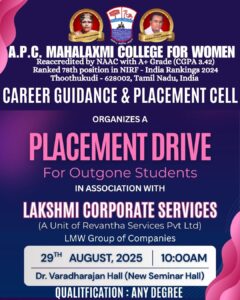 The Career Guidance & Placement Cell, in association with Lakshmi Corporate Services (LMW Group of Companies), Coimbatore, organized a Campus Interview for the outgone students on 29th August 2025 at 10.00 a.m. for the post of Executive Trainee. The programme commenced with a pre-placement talk by Mr. Ravi Sankar, Business Unit Head, who offered valuable insights into corporate expectations, career growth, and skill development. His address greatly benefited both the alumnae participants and the III UG students, motivating them to pursue professional excellence with confidence.