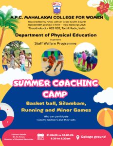 The Department of Physical Education of A.P.C. Mahalaxmi College for Women, Thoothukudi, is organizing a Summer Coaching Camp as part of its Staff Welfare Programme. The camp aims to promote physical fitness, skill development, and recreational engagement among faculty members and their children.