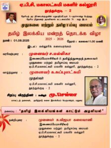 ஏ.பி.சி. மகாலட்சுமி மகளிர் கல்லூரியின் முதுகலை மற்றும் தமிழாய்வு மையம் 2025–2026 ஆம் கல்வியாண்டிற்கான தமிழ் இலக்கிய மன்றத்தின் தொடக்க விழாவை 01.08.2025 அன்று காலை 11.00 மணிக்கு கல்லூரிக் கலையரங்கத்தில் சிறப்பாக நடைபெற்றது.